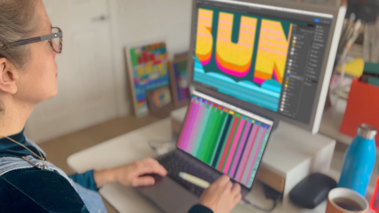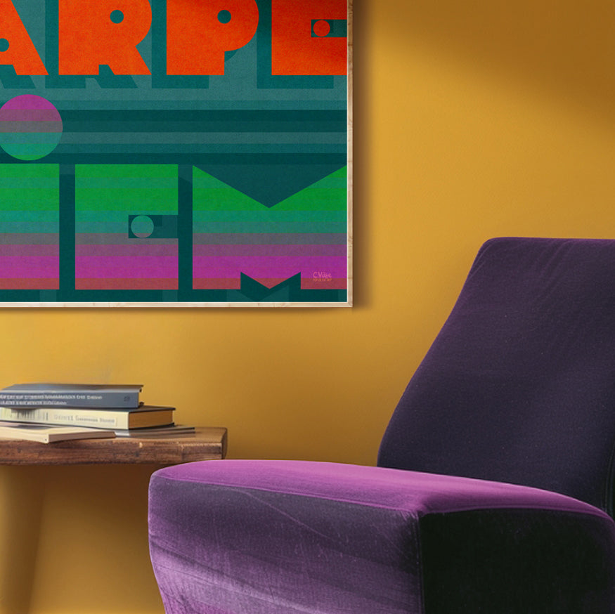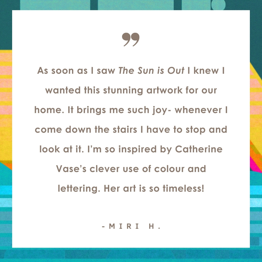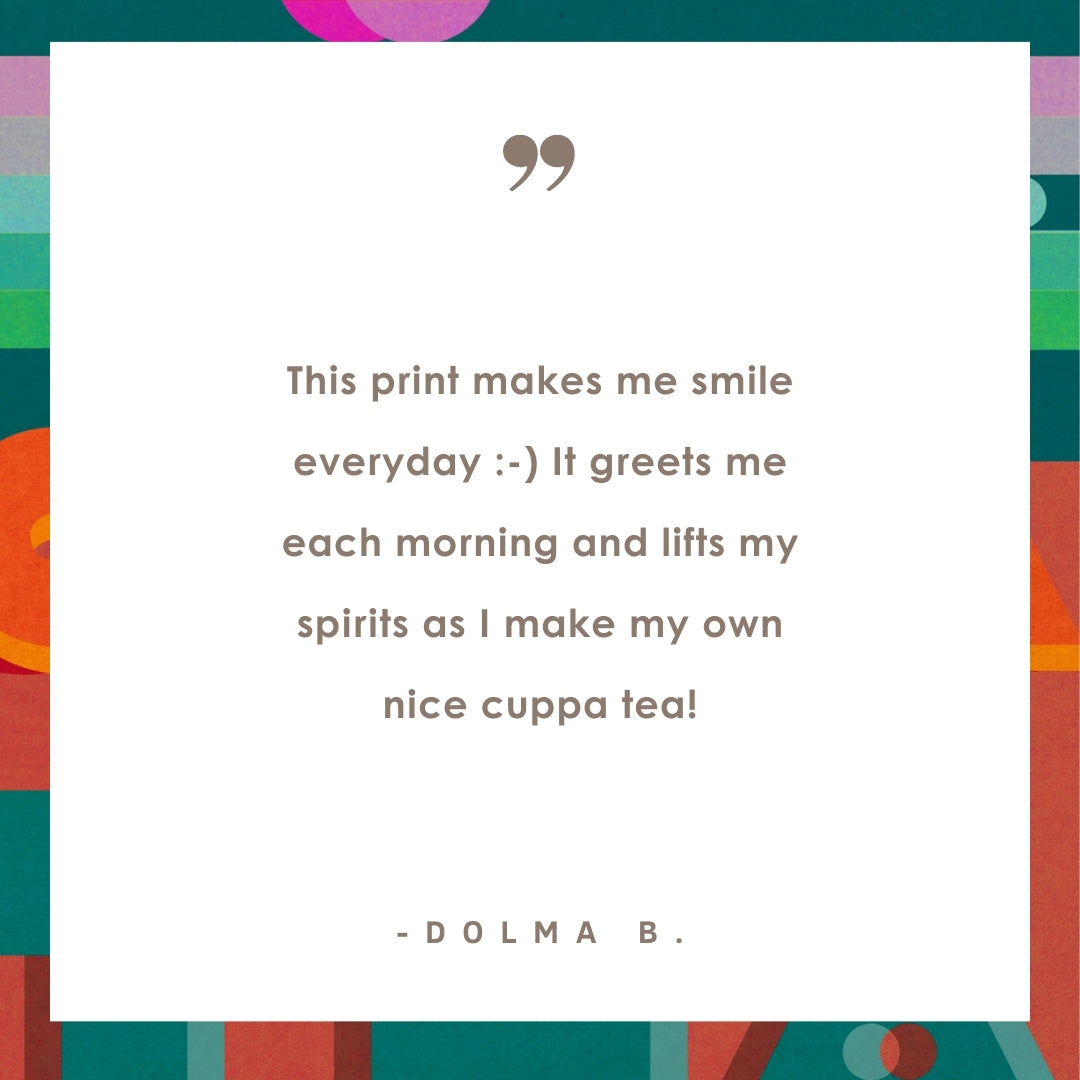 Using Photoshop, I transform these sketches and elements into vibrant, layered collages, allowing me to blend colours, shapes, and lettering intuitively, and create artwork that inspires, uplifts, and fills walls with colour and joy.