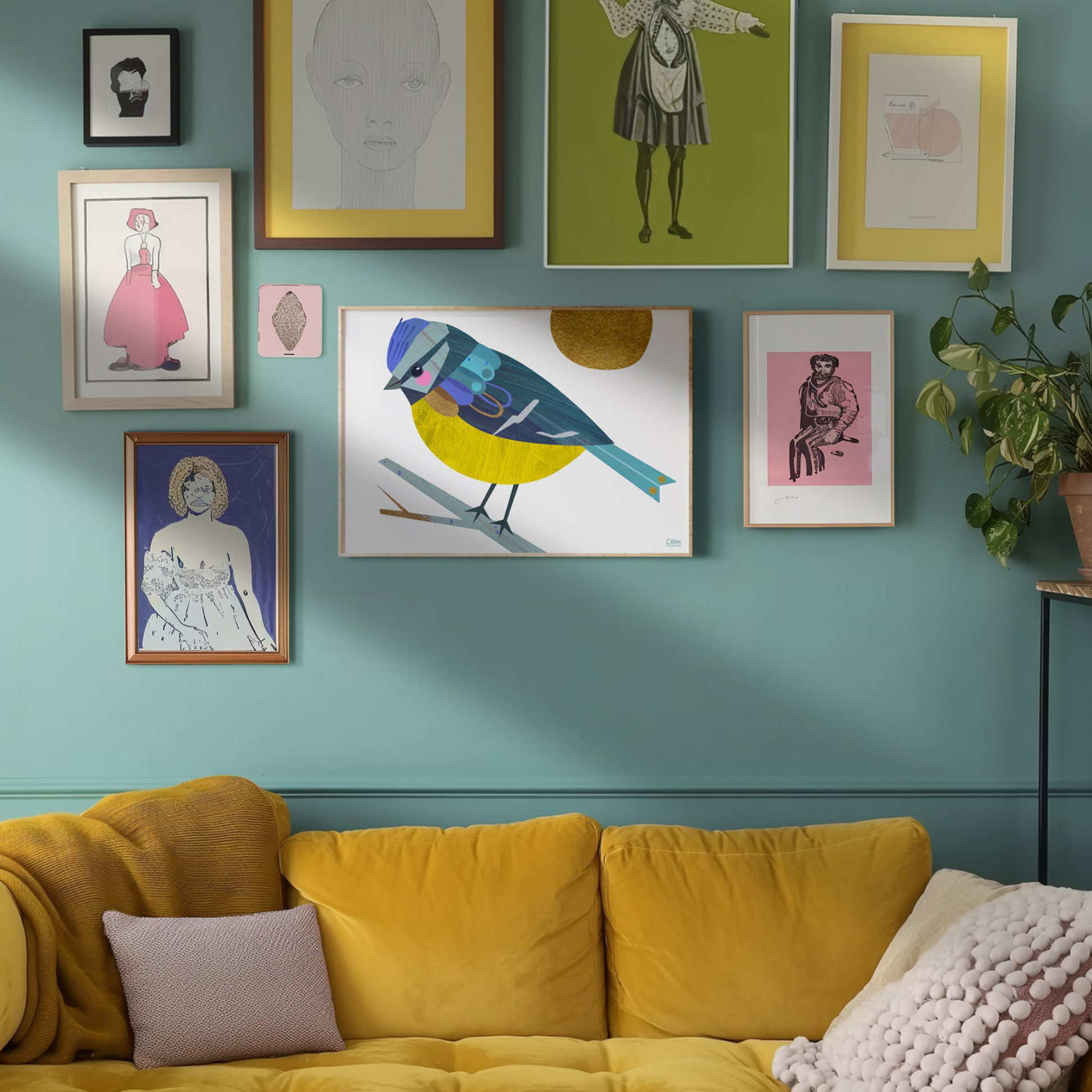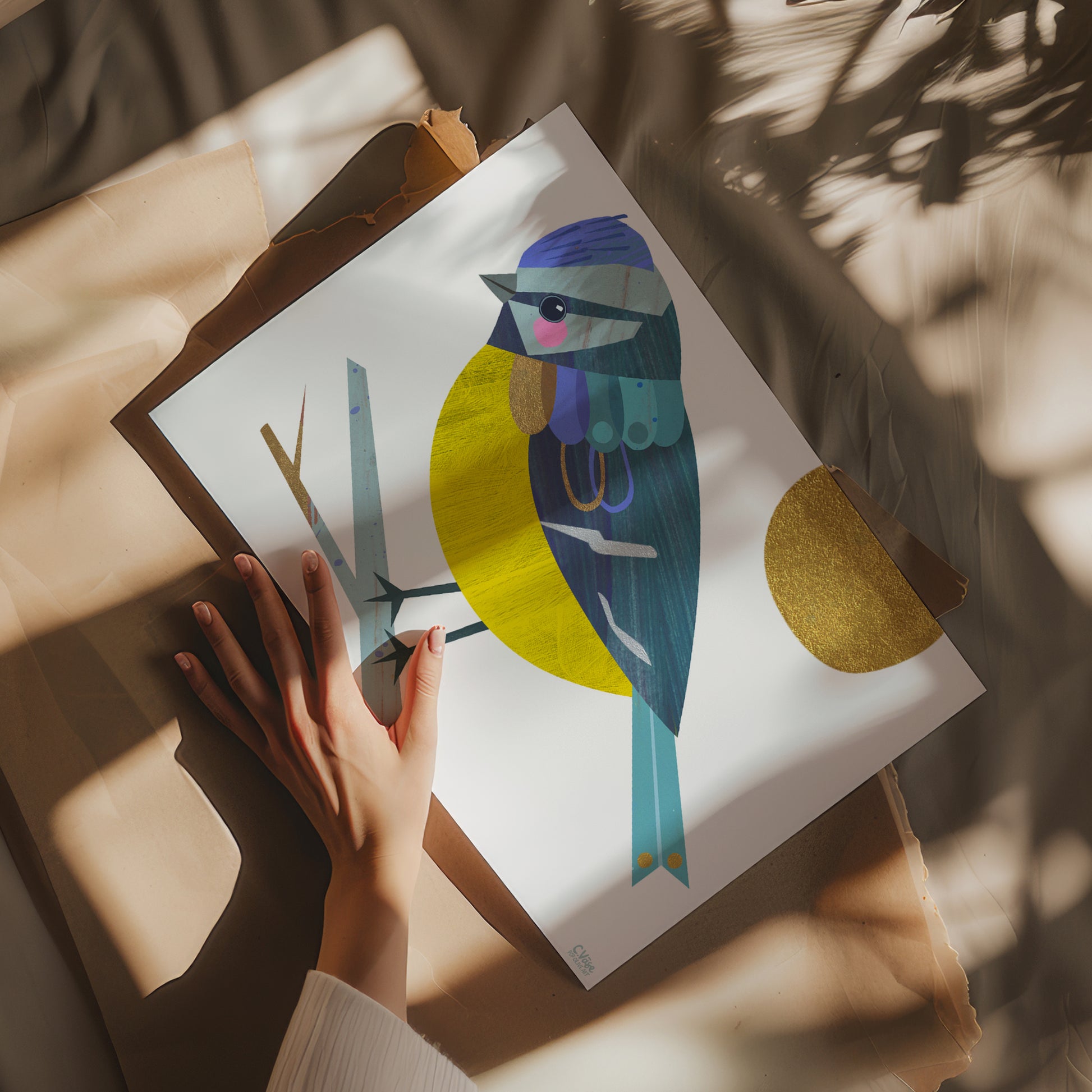 Blue Tit is a vibrant, geometric collage print that radiates charm and playfulness. This piece is meticulously crafted with layers of bold textures of blue and golden hues. It is a testament to the whimsical beauty of nature and the joy it brings. Perfect for adding a splash of colour and life to any space. Let this delightful bird inspire happiness in your home.