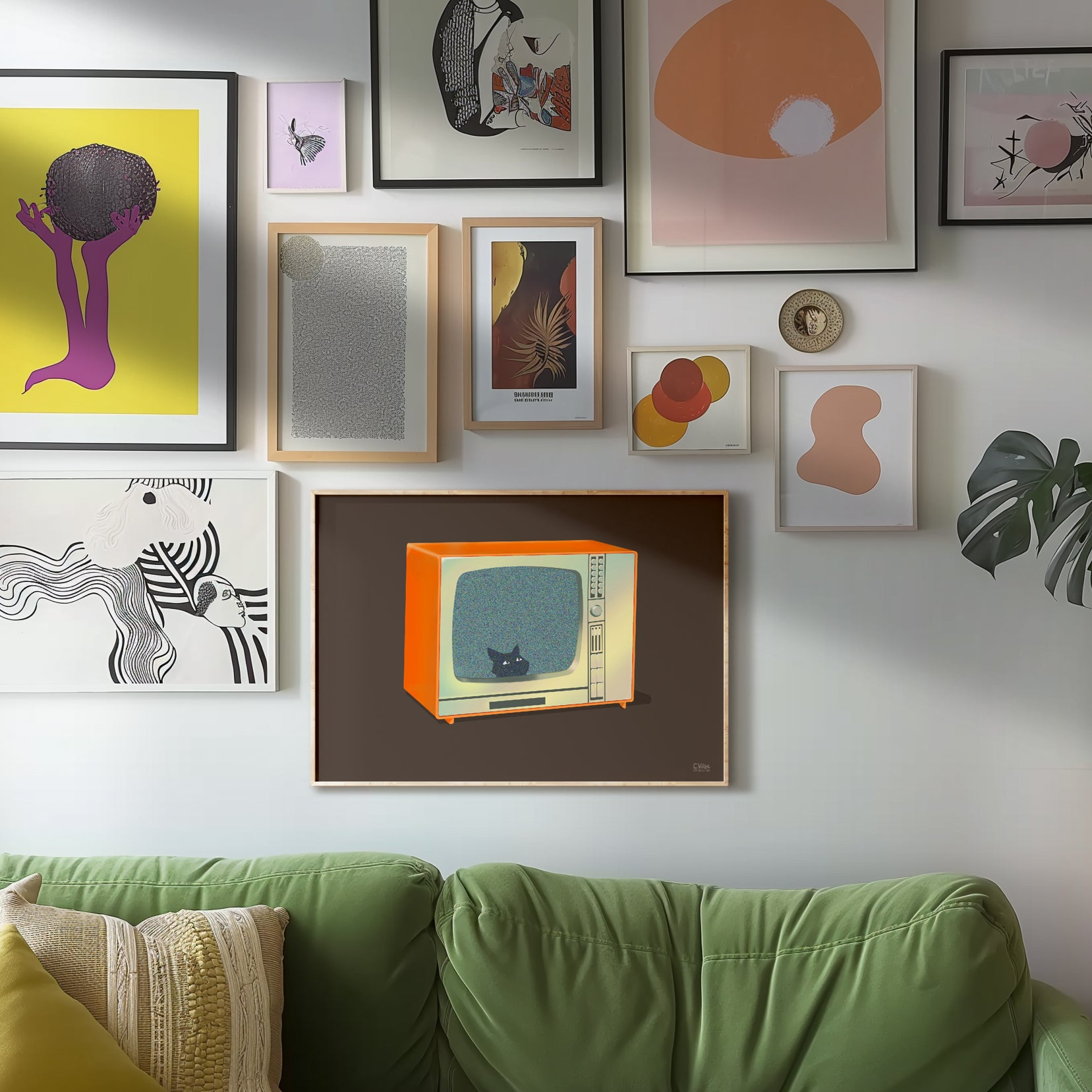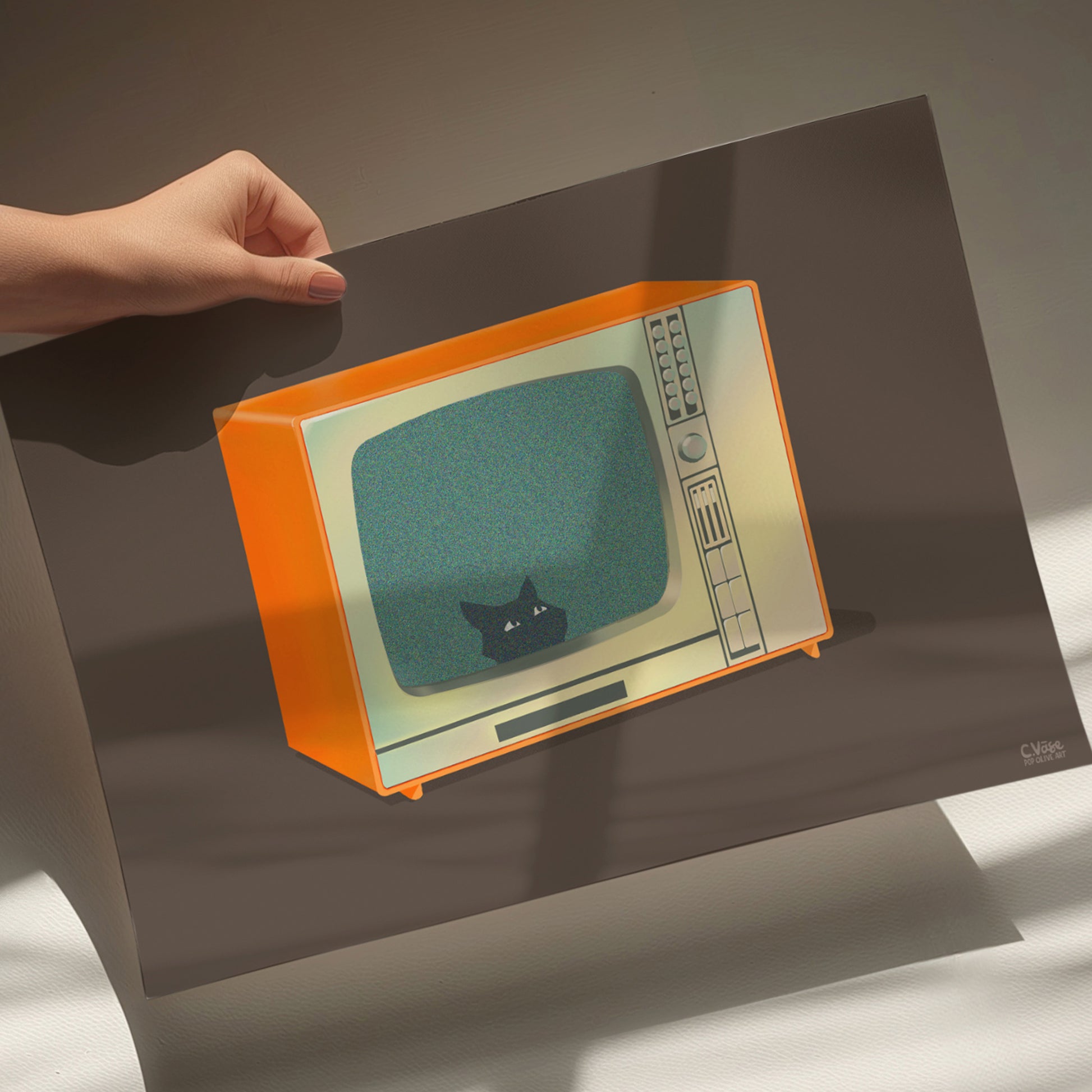 Embrace the whimsical charm of TV Cat Souvenir. This nostalgic print captures the essence of childhood holidays with a playful nod to vintage TV souvenirs. The vibrant, retro design of an old television with a feline twist brings a touch of humour and warmth to any space. Perfect for adding a splash of colour and a smile to your home, this artwork is a delightful reminder of simpler times and the joy found in everyday moments. Celebrate your love for quirky, joyful art with this unique print, designed to uplift and inspire.